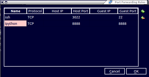 Add a new rule with "name => ssh, protocol => TCP, Host Port => 3022, Guest Port => 22", and everything else BLANK.